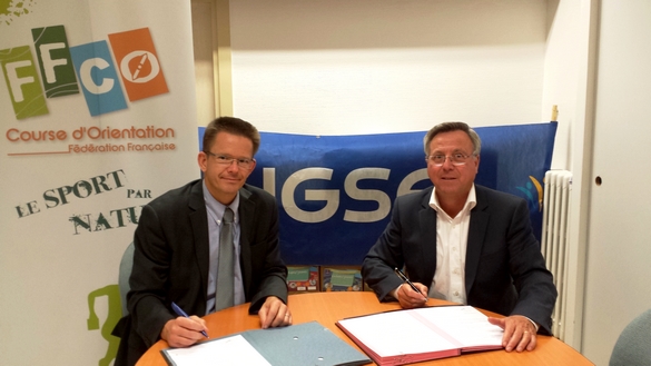 09/10/2014 : signature de la convention partenariale entre le Président de la FFCO (Michel EDIAR) et le Président de l'UGSEL (Daniel RENAUD)